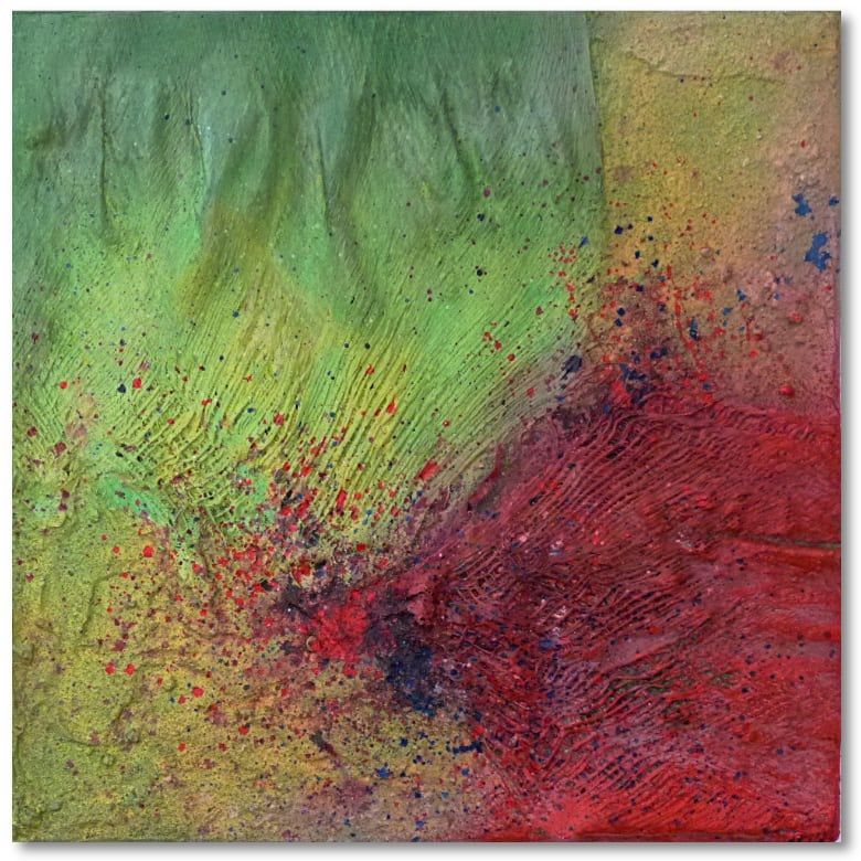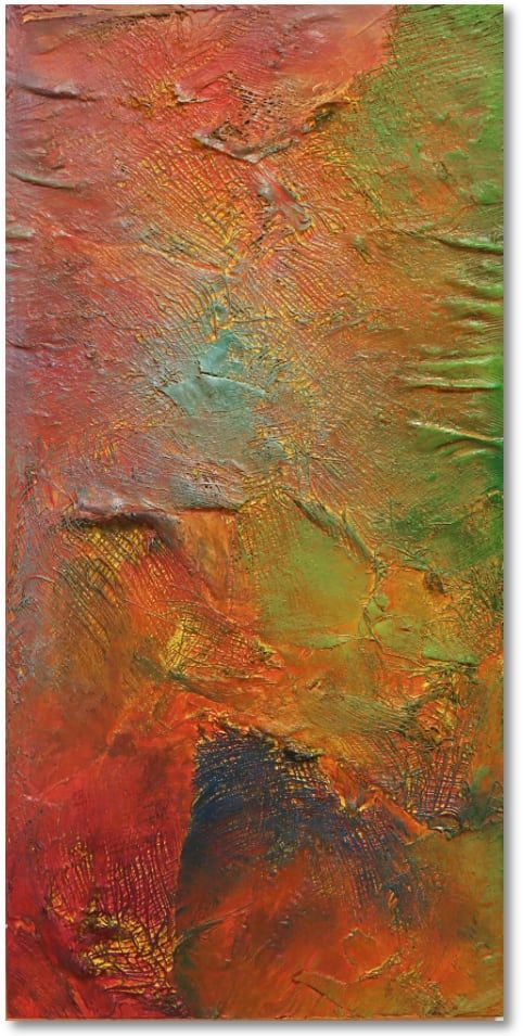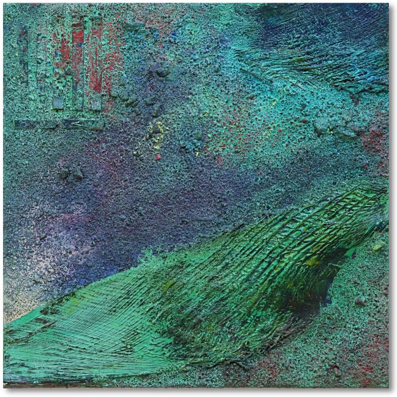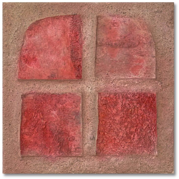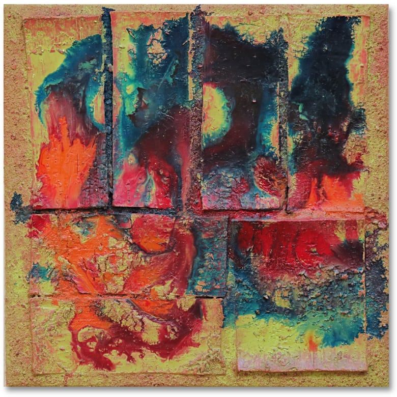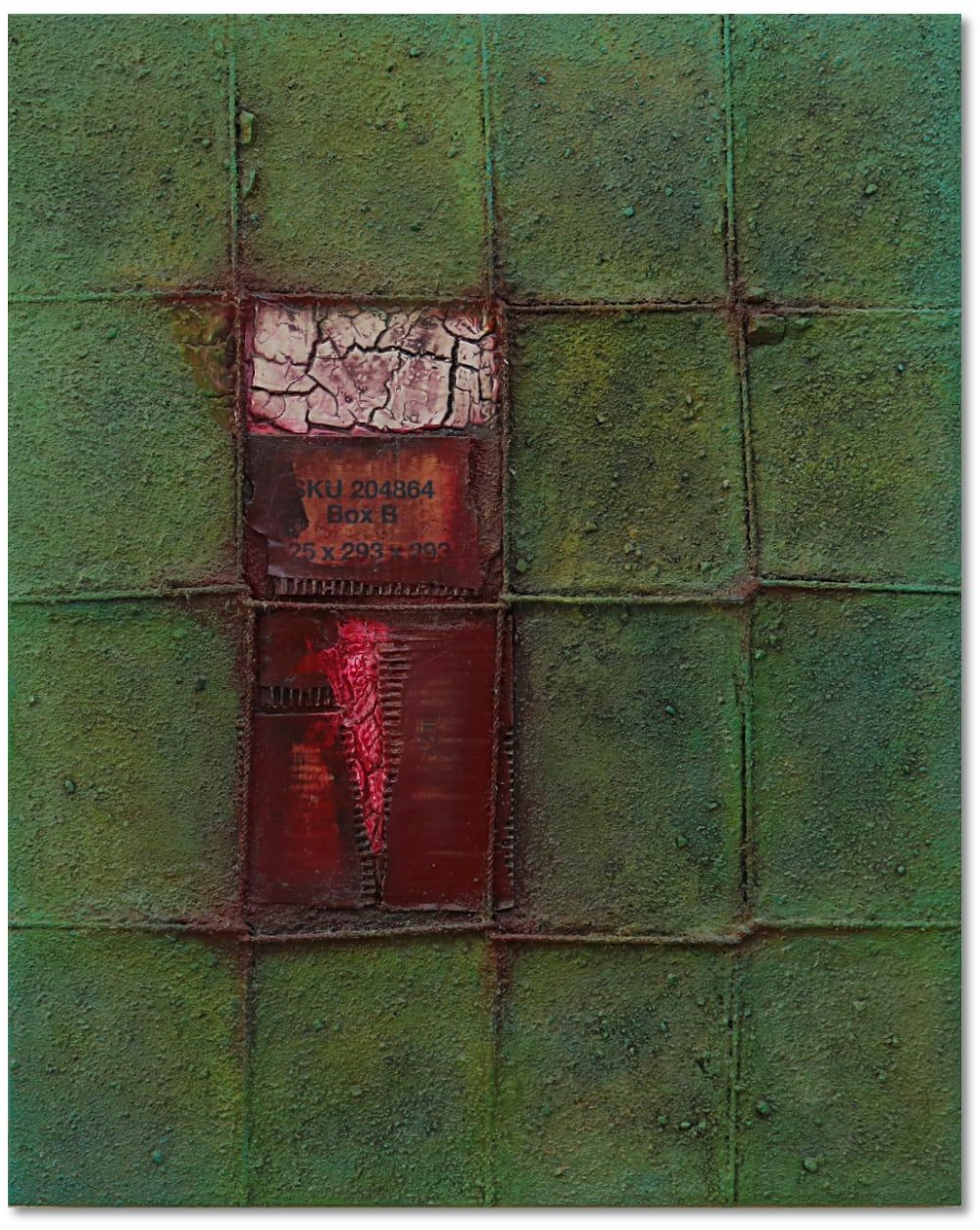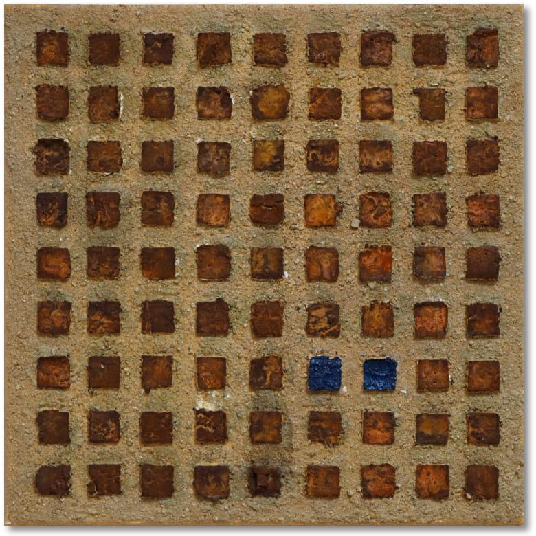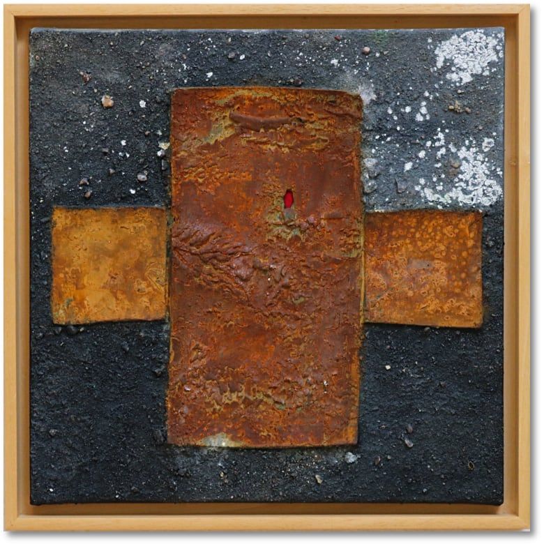 PreisAcryl, Kokosfasern, Rost, Sand und Spachtel auf Leinwand mit Keilrahmen.