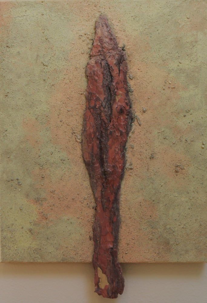 PreisAcryl, Birkenrinde, Kokosfasern, Sand und Spachtel auf Leinwand mit Keilrahmen.