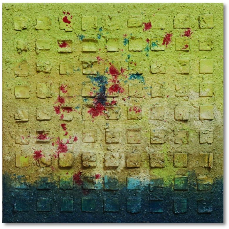 PreisAcryl, Papier, Sand, Eierschalen und Spachtel auf Leinwand mit Keilrahmen.
