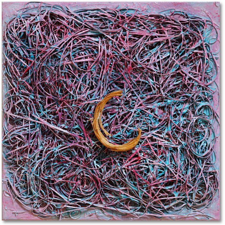 PreisAcryl, Kokosfasern, Karton und Spachtel auf Leinwand mit Keilrahmen.