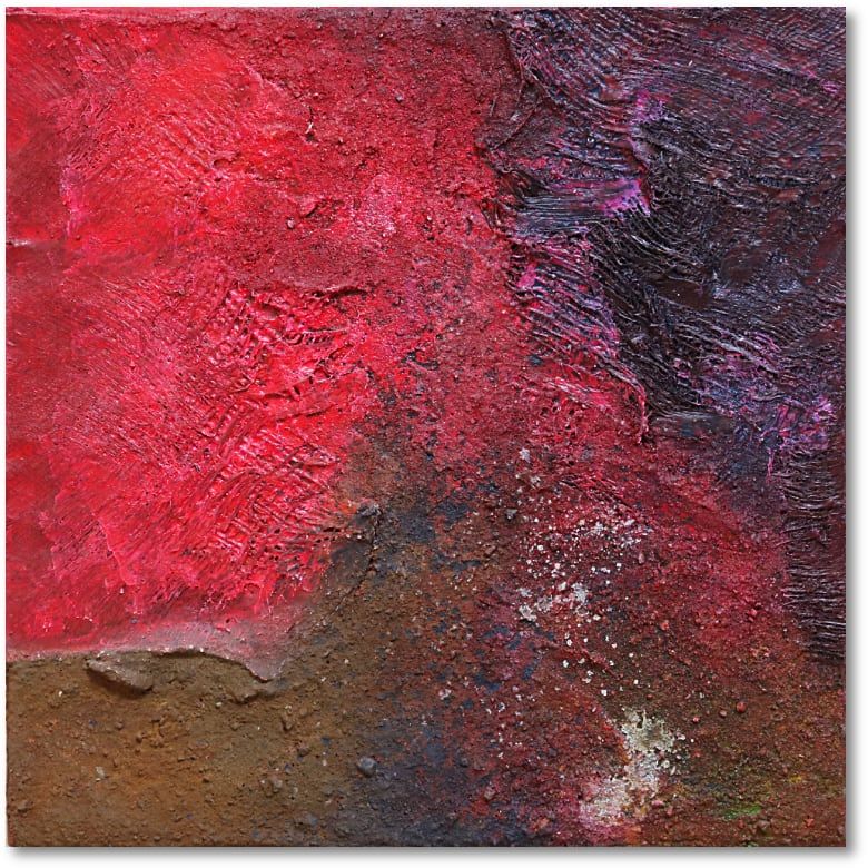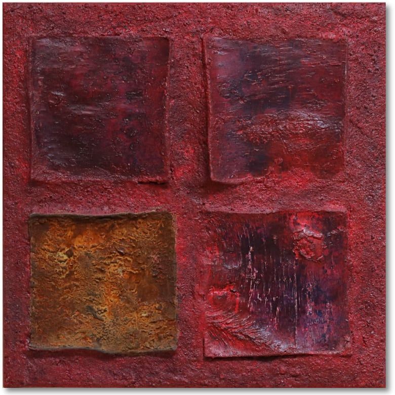 PreisAcryl, Kokosfasern, Rost, Sand und Spachtel auf Leinwand mit Keilrahmen.